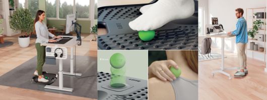 A munka közbeni állás előnyeinek maximalizálásához kiváló megoldás lehet az új LEITZ aktív álláskönnyítő szőnyeg, illetve a LEITZ egyensúlyozó deszka, amelyek javítják a testtartást, csökkenthetik a hátfájást és növelhetik az energiaszintet. Az új LEITZ „Ergo” egyensúlyozó deszka alacsony intenzitású ringatózó mozgással aktiválja a törzset és a lábakat, természetes mikromozgásokra ösztönözve állás közben. Ez a sokoldalú egyensúlyozó deszka ideális álló asztalokhoz, ülő testhelyzetben lábtámaszként is használható, és fitnesz gyakorlatokhoz is bevethető. A kemény felületeken való állás okozta fáradtság és kényelmetlenség csökkentésére tervezett új LEITZ „Ergo Active” álláskönnyítő szőnyeg puha habszivacs párnázattal, emelt peremmel és változatos masszázs zónákkal rendelkezik, így kényelmesen állhat és folyamatosan mozoghat az állómunka során. Az egyensúlyozó deszka és az álláskönnyítő szőnyeg is kiegészül egy kivehető masszázs labdával, amely egész nap célzott izomlazítást biztosít.